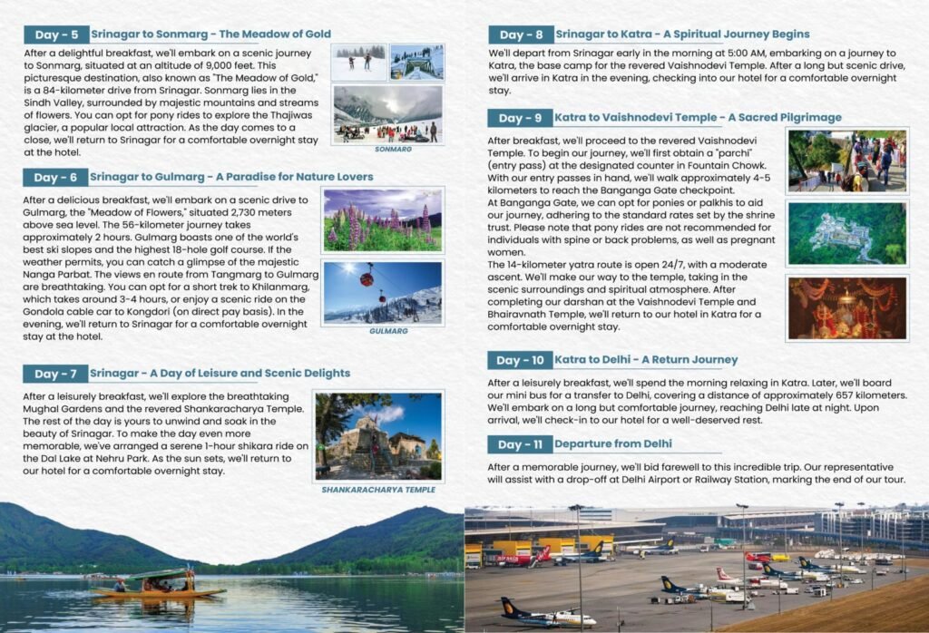 Experience the breathtaking beauty of Kashmir and the spiritual serenity of Vaishnodevi with this 10-day tour. Starting from Kurukshetra to the mesmerizing valleys of Srinagar, this trip blends devotion, patriotism, and natural splendor into one unforgettable journey.